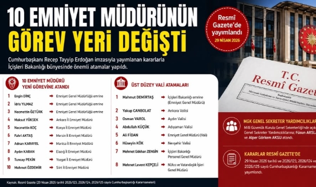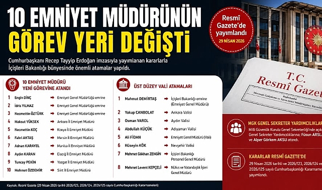 Emniyet Genel Müdürlüğünde de atamalar oldu. Ankara İl Emniyet Müdürü Engin Dinç, Mersin İl Emniyet Müdürü İdris Yılmaz ve Siirt İl Emniyet Müdürü Necmettin Öztürk, Emniyet Genel Müdürlüğü emrine atandı.