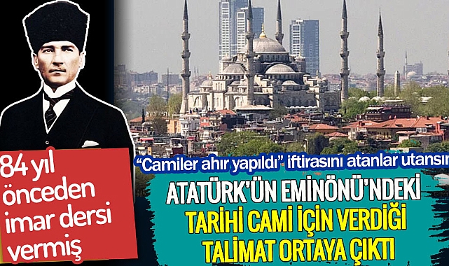 “GALATA’DAN BAKANLARIN GÖZÜNE ÇARPACAK”Onuş, işe, Eminönü Meydanı’nın açılmasıyla başlanacağını aktardı. Onuş, yazı dizisinde buna ilişkin şu bilgiler yer aldığını belirtti:“Mimar Davud’un asırlara meydan okuyan Koca Sinan sisteminde inşa ettiği Yeni Cami’nin etrafını açmak, bu mabedi bütün zarafetiyle ortaya koyacak bir etraf temizliği ile imar hareketlerine girişmek, Türk sanatının, Türk mimarisinin zarif büyüklüğünü, yüce zarafetiyle birlikte İstanbul’a Galata’dan bakanların gözlerine çarptıracaktı.”“DARISI BAŞINA…”Sinan Onuş, aslında Yeni Cami’nin etrafının açılma fikrinin Atatürk’ün zihninde 1935’ten beri olduğunu söyledi. Bunun için de dizide yer alan şu cümleleri ve dönemin gazetelerinde yer alan bir karikatürü kanıt olarak gösterdi:“Atatürk’ün kafasında bu eserlerin Türk milletine yaraşır şekilde yer alması için Atatürk hep emirler veriyor. Örneğin, 1935’te Meclis’in açış nutkunda millete, vekillerinin huzurunda imar işlerine başlanacağını açıkça söylüyor. Dönemin gazetelerinde yer alan bir karikatür durumu net anlatıyor. Çünkü Yeni Cami, Süleymaniye Cami’ne ‘darısı başına’ diyor.”84 YIL ÖNCE 84 YIL SONRA“Atatürk’ün Savarona’daki 56 Günü” isimli kitaptaki bu ayrıntılar, geçtiğimiz aylarda gündem olan Süleymaniye Cami’nin bozulan silueti tartışmalarını hatırlattı.Süleymaniye semtinin Fatih Demirtaş Mahallesi’nde kentsel dönüşüm çalışmaları nedeniyle İlim Yayma Vakfı için inşa edilen ve 2024'te bitmesi planlanan yapı, Süleymaniye Cami'nin silüetini bozduğu gerekçesiyle sosyal medyada büyük tepkilere neden olmuştu.BARBAROS’UN TÜRBESİNİ DE ATATÜRK TEMİZLETTİİkdam gazetesinde 13 Haziran-13 Ağustos 1939 günleri arasında yayınlanan yazı dizisini kitap haline getiren Sinan Onuş, Atatürk’ün, “geçmişi olmayanın geleceği olmaz” sözünü bu imar işlerini takip ederken net ortaya koyduğunu söyledi.Onuş, “Ebedi Şef, evvelce verdikleri bir emirle Beşiktaş Vapur İskelesi civarında bulunan Barbaros’un türbesi etrafının açılmasını, burasının bir park haline getirilmesini, Türk denizcilerine emsalsiz bir tarih hediye eden Koca Hızır Barbaros Hayrettin’in türbesinin bir deniz ziyaretgâhı haline konulmasını ilgililere bildiriyor” dedi.SULTANAHMET CAMİİ’NİN SİLUETİNİ BOZAN İKİZ KULELERSultanahmet Camii’nin siluetini bozan Zeytinburnu’ndaki ikiz kuleler için yıkım kararı çıkmıştı. Ancak yıkım gerçekleşmedi. Gökdelenler hala yerinde duruyor ve Sultanahmet Camii’nin siluetini bozmaya devam ediyor.Cumhurbaşkanı Recep Tayyip Erdoğan, Zeytinburnu’ndaki kuleler kendisine sorulduğunda, “Sahibiyle küstüm, kendisiyle konuşmuyorum” demişti. (Odatv)