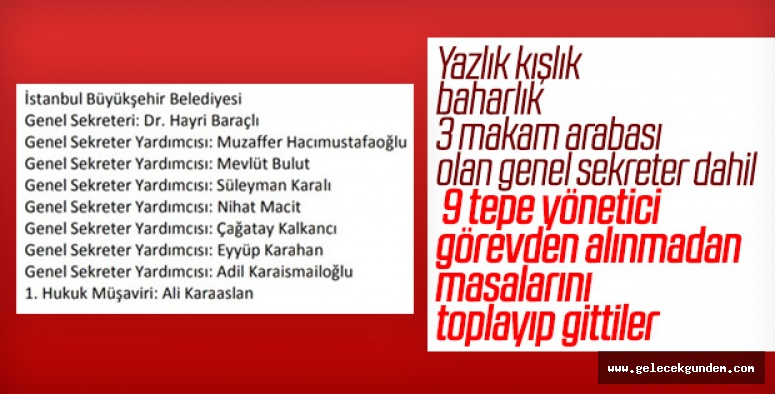 İBB Genel Sekreteri Hayri Baraçlı, genel sekreter yardımcıları Muzaffer Hacımustafaoğlu, Mevlüt Bulut, Süleyman Karalı, Nihat Macit, Çağatay Kalkancı, Eyyüp Karahan, Adil Karaismailoğlu ve Hukuk Müşaviri Ali Karaaslan ortak bir açıklama yaparak kendi istekleri ile görevlerini bıraktıklarını duyurdular.İMAMOĞLU “23 HAZİRAN’DAN SONRA GÖRÜŞÜRÜZ” DEMİŞTİEkrem İmamoğlu, mazbatası elinden alındıktan sonra yaptığı bir açıklamada, 31 Mart’tan sonraki 18 günlük İBB Başkanlığı döneminde İBB’de çok sayıda makam aracı tespit ettiklerini söylemişti.İmamoğlu, İBB bünyesinde 643 yöneticiye karşılık 1717 makam aracı; 48 yöneticinin bulunduğu İETT'de 150 kiralık makam aracı bulunduğu, İBB'ye bağlı İSKİ'nin yönetici kadrosunda 124 kişi bulunmasına rağmen 874 adet kişiye tahsisli araç bulunduğunu duyurmuştu. İmamoğlu’nun bu sözlerini Baraçlı yalanlamış, İmamoğlu da “Bir genel sekreter, kahvaltı verip insanları kışkırtmaz. Onun için muhatabım değil. 24 Haziran’da Sayın Genel Sekreter, size makam arabalarınızı gösteririm” demişti.