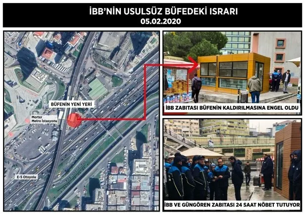 İBB ZABITALARI NÖBET TUTTUİstanbul Büyükşehir Belediyesi'nin encümen kararı ve izin belgesi olmadan, Merter Metro İstasyonu ve otobüs durağının yanına kaçak bir büfe kurulmuştu. Güngören Belediyesi zabıta ekipleri büfenin kaldırılmasını istemişti. İBB buna karşı çıkmıştı ve büfenin başına zabıta ekiplerini dikmişti. İBB zabıtası, 'Güngören Belediyesi kaçak büfeyi kaldırmasın' diye 24 saat nöbet tutmuştu.