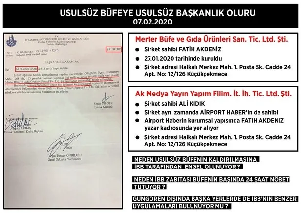 KIDIK'IN PARAVAN ŞİRKETİ Mİ?Kaçak büfeyi işleten şirketin sahibi ise Airport Haber'den çıktı. İstanbul Ticaret Odası kayıtlarında, Merter Büfe ve Gıda Ürünleri Sanayi Ticaret Şirketi'nin sahibi Fatih Akdeniz olarak görünüyor. 21 Ocak 2020'de kurulan şirket Halkalı'da…Ne tesadüftür ki, Fatih Akdeniz, Ali Kıdık'ın sahibi olduğu Airport haberin kurumsal yapısında yazar kadrosunda yer alıyor