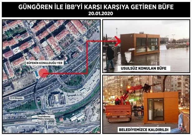 BÜFE KALDIRILDIMERTER metro istasyonunun yanına kurulan büfe akşam saatlerinde olduğu yerden kaldırıldı. İBB Meclis toplantısında söz alan Güngören Belediye Başkanı Demir, büfenin İyi Partili meclis üyesi Ali Kıdık'a ait olduğunu iddia etmişti.