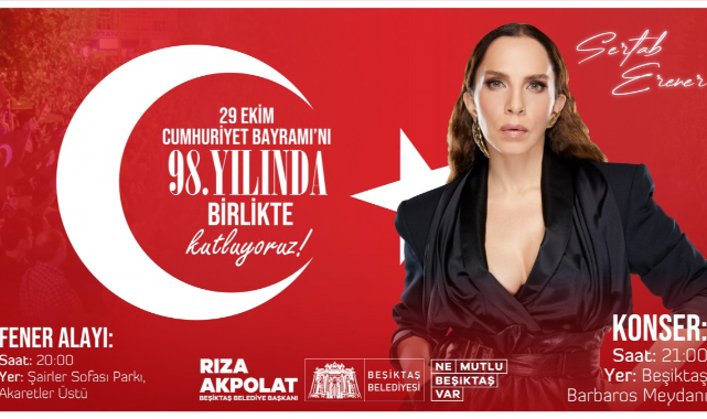 Fener alayı sonrası 21.00’da Türk pop müziğinin güçlü seslerinden Sertab Erener, Barbaros Meydanı’nda, Beşiktaş Belediyesi’nin Cumhuriyet Bayramı’nın 98. yılına özel düzenlediği konserde İstanbullularla buluşacak.