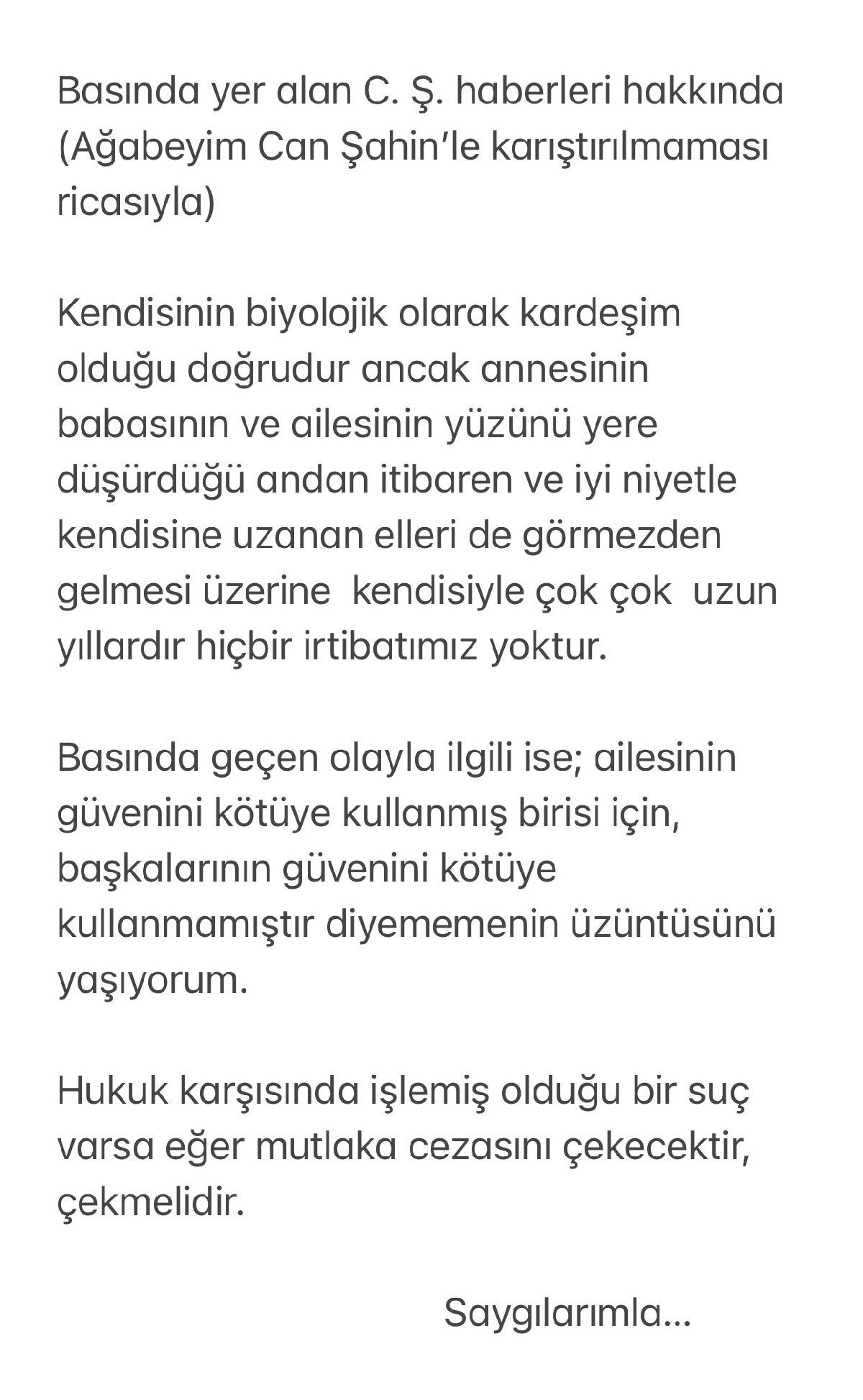 Fatsa 1.Asliye Ceza Mahkemesi’nce “Hizmet nedeniyle güveni kötüye kullanmak” suçundan hakkında arama kaydı bulunan Ordu'da bir hastanede yönetici olduğu belirlenen C.Ş. (41) dün Fethiye'de yakalandı.C.Ş. ifadesinde İstanbul CHP İl Başkanı Canan Kaftancıoğlu’nun kardeşi olduğunu söyledi.Nöbetçi Cumhuriyet Savcısı’nın talimatı doğrultusunda gözaltına alınan C.Ş. bugün Fethiye Adliyesi’ne sevk edilecek.CANAN KAFTANCIOĞLU’NDAN AÇIKLAMAKonuyla ilgili kişisel Twitter hesabından açıklama yapan Kaftancıoğlu, şu ifadeleri kullandı:* Basında yer alan C.Ş haberleri hakkında (Ağabeyim Can Şahin’le karıştırılmaması ricasıyla) Kendisinin biyolojik olarak kardeşim olduğu doğrudur ancak annesinin babasının ve ailesinin yüzünü yere düşürdüğü andan itibaren ve iyi niyetle kendisine uzanan elleri de görmezden gelmesi üzerine kendisiyle çok çok uzun yıllardır hiçbir irtibatımız yoktur.* Basında geçen olayla ilgili ise; ailesinin güvenini kötüye kullanmış birisi için, başkalarının güvenini kötüye kullanmamıştır diyememenin üzüntüsünü yaşıyorum. Hukuk karşısında işlemiş olduğu bir suç varsa eğer mutlaka cezasını çekecektir, çekmelidir.