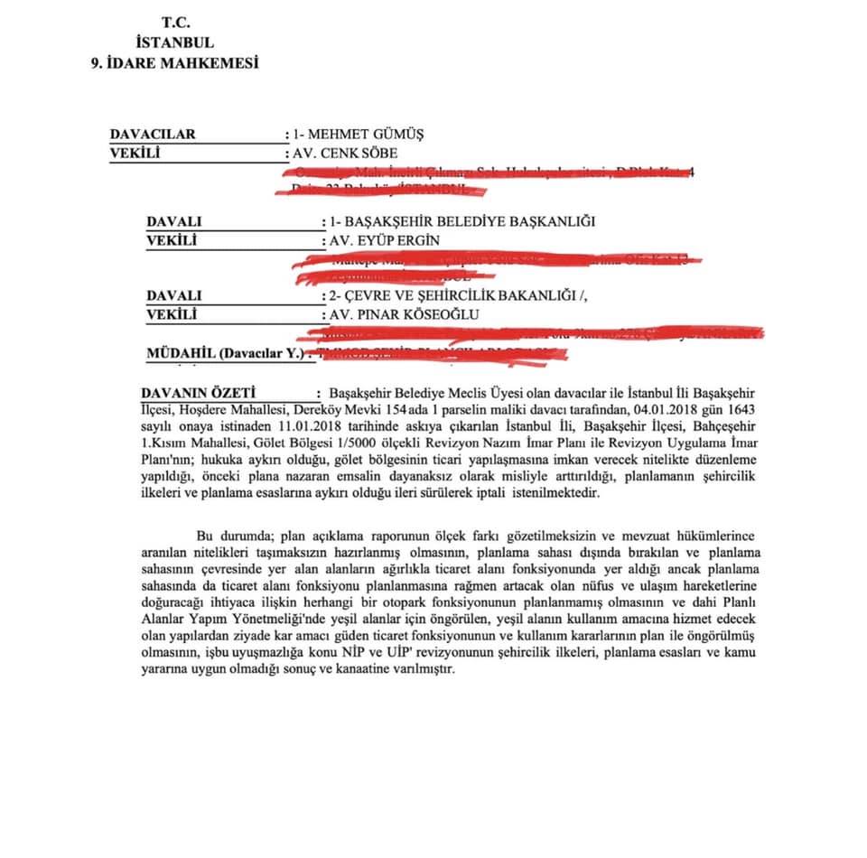 CHP'li Başakşehir Belediye Meclis Üyeleri Mehmet Gümüş, Zeynel Yılmaz, Erdoğan Dulkadir, Murat Özkurt, Ayhan Geygel tarafından en son 4 Ocak 2018 tarihinde onaylanan Başakşehir Bahçeşehir 1. Kısım Mahallesi Gölet Bölgesi imar planlarının iptali istemi ile  Başakşehir Belediyesi ve Çevre ve Şehircilik Bakanlığı'na açılan dava açılmıştı.
