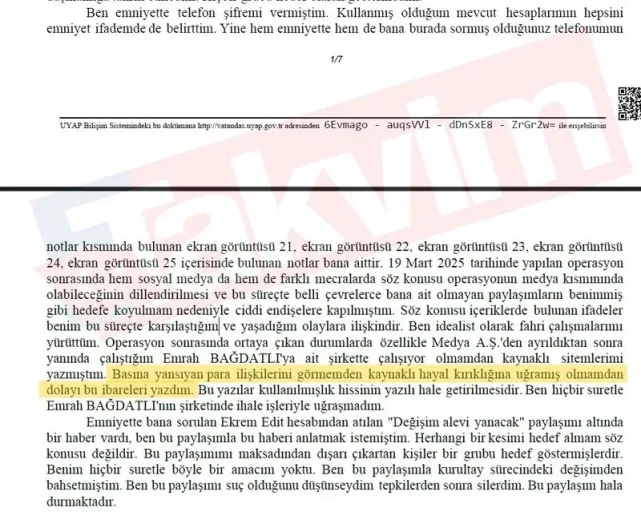 Gün emniyetteki ifadesinde, sosyal medya yöneticisi olduğunu ve "istanbulbld" isimli sosyal medya hesabını yönettiğini söyledi.Medya AŞ'de çalıştığı dönemde, kurumsal sosyal medya uzmanı olduğunu, yönettiği hesaplarda milli ve dini değerlere hakaret içerikli paylaşımlar yapmadığını belirten Gün, "Çalıştığım 5 yıl boyunca bu hesabın (istanbulbld) yönetimini ve yapılan paylaşımların kontrolünü bizzat yaptım. Bu hesap üzerinden yanlış bir haber veya toplumu manipüle edecek bir paylaşım yapılmamıştır." dedi. "KENDİMİ İFADE EDEBİLMEK AMACIYLA TELEFONUMDA BÖYLE BİR NOT OLUŞTURDUM"Şüpheli Gün'ün polis ekiplerine telefon şifresini vermesiyle ulaşılan notlar kısmındaki yazıları şöyle:"Medya AŞ'ye operasyon yapıldığı anda herkes sudan çıkmış balığa döndü. Bizim henüz 1 yıl dolmadan tamamen iyi niyetlerle herkesin yaptığı şeyleri yaptığımızı bildiğimiz konularda neden diken üstünde olduğunuzu anlayamadım. Okuduğum haberler, soruşturma detayları şekillendikçe, burada bir sistem kurulduğunu anlamıştım. ...Yıllardır üzerine kurmaya çalıştığım kariyer planlamasında sanki boşa düşüldü bu durumda hem canım sıkıldı hem kamuda ilerleyemedim hem işsiz kaldım hem geçmişini bilmediğim bir sistemin parçası yapılmaya çalışıldığımı anladım. ....Emrah Bağdatlı İngiltere'de yaşamaktadır. ...Daha önce de dediğim gibi 3 veya 4 kez aynı ortamda bulunduğum bu kişi ile soruşturma başladıktan sonra neler olacağına dair Telegram üzerinden konuşmaya başladık. Bir şekilde başlarda siyasi sandığım durumlarda ilginç bilgilere ben de rastlayınca aslında ailemi bu işten kurtarmak için fırsat kollamaya başladım. Yıllardır her şeyini yaptığım işlerde bir anda vebalı muamelesi de görünce anladım ki herkes kendini kurtarmaya çalışıyor. Yanlış bir şey varsa neden soruşturmadan önce ses etmediler diye düşünmeye başladım, sonucunda da bu ekipten kopmak istediğimi anladım." Gün, telefonuna bu notları neden yazdığı sorusuna şu yanıtı verdi:"Ekrem İmamoğlu'nun cumhurbaşkanlığı için aday olmasını desteklediğimden dolayı şahsen görüşümü ifade edebilmek ve destek olabilmek amacıyla 'ekremedit' isimli sosyal medya hesabını oluşturdum. Sözcü TV isimli kanalda gazeteci İsmail Saymaz ve Altan Sancar'ın 'CHP Kurultayı Özel Canlı Yayını' içerisinde Kemal Kılıçdaroğlu'nun adaylıktan çekileceğini ifade etmeleri üzerine ben de 'ekremedit' isimli hesabım üzerinden Ekrem İmamoğlu ve Kemal Kılıçdaroğlu'nun resimlerini yan yana koyarak 'Kemal Kılıçdaroğlu çekiliyor, Ekrem İmamoğlu ikna etti' şeklinde bir paylaşım yapmıştım. Daha sonra Kemal Kılıçdaroğlu 'ekremedit' isimli sayfamın paylaşımını ifade ederek böyle bir paylaşım yapıldığından dolayı kararını değiştirdiğini ifade etmiş, bu süreçte Kemal Kılıçdaroğlu'nun sosyal medya hesaplarıyla ilgilenen kişiler benim 'ekremedit' isimli hesabın yöneticisi olduğumu bildikleri için hedef gösterdiler. Eğer benim paylaşımımdan dolayı sorun yaşanacaksa beni işten çıkarmalarını o dönem yöneticime söyledim. Onlar da bana 'Hayır öyle bir şey söz konusu değil sen işine devam et sadece bir süre paylaşım yapma.' dediler. Sosyal medya platformlarında ifşa olduğum için şahsım hedef haline geldi. Ben de ailem de zor durumda kaldığı için hem kendimi ifade edebilmek amacıyla hem de olurda ifade etme şansım olmaz diye telefonumda böyle bir not oluşturdum." "HEDEFE KOYULMAM NEDENİYLE CİDDİ ENDİŞELERE KAPILMIŞTIM"Mahir Gün, savcılıktaki ifadesinde ise firari şüpheli Emrah Bağdatlı'nın Karpuz Medya isimli firmasında 7-8 ay kadar çalıştığını söyledi.Telefonunun notlar kısmındaki yazılarına ilişkin şüpheli Gün, şunları kaydetti: "19 Mart'ta yapılan operasyon sonrasında hem sosyal medyada hem de farklı mecralarda söz konusu operasyonun medya kısmının da olabileceğinin dillendirilmesi ve bu süreçte belli çevrelerce bana ait olmayan paylaşımların benimmiş gibi hedefe koyulmam nedeniyle ciddi endişelere kapılmıştım. Söz konusu içeriklerde bulunan ifadeler benim bu süreçte karşılaştığım ve yaşadığım olaylara ilişkindir. Ben idealist olarak fahri çalışmalarımı yürüttüm. Operasyon sonrasında ortaya çıkan durumlarda özellikle Medya AŞ'den ayrıldıktan sonra yanında çalıştığım Emrah Bağdatlı'ya ait şirkette çalışıyor olmamdan kaynaklı sitemlerimi yazmıştım. Basına yansıyan para ilişkilerini görmemden kaynaklı hayal kırıklığına uğramış olmamdan dolayı bu ibareleri yazdım. Bu yazılar kullanılmışlık hissinin yazılı hale getirilmesidir." Şüpheli Gün, Bağdatlı'nın şirketinin ihale işleriyle uğraşmadığını, emniyette kendisine "ekremedit" hesabından yaptığı "Değişim alevi yanacak" paylaşımının altında bir haber olduğunu, bu paylaşımla oradaki haberi anlatmak istediğini öne sürdü.Herhangi bir kesimi hedef almadığını, bu paylaşımla kurultay sürecindeki değişimden bahsettiğini, suç olduğunu düşünse tepkilerden sonra sileceğini ifade eden Gün, paylaşımın hala durduğunu anlattı.