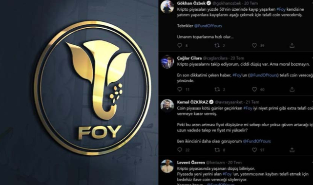 Çağlar Cilara, Gökhan Özbek, Kemal Özkiraz ve Levent Özeren Twitter mesajlarında Foy Token’in kripto paradaki düşüşe rağmen “telafi coin” vereceğini iddia etti.ADLİ BİLİŞİM UZMANI TUNCAY BEŞİKÇİ: SİZ REKLAMINI NE KARŞILIĞINDA YAPIYORSUNUZ?Adli bilişim uzmanı Tuncay Beşikçi, Foy Token ile ilgili dikkat çeken mesajlar yayımladı.Tuncay Beşikçi, şirketi incelediğini belirtip “Bu token'ın arkasındaki şirket 3 aylık, projesi belli değil, sitesi yok, white paper yok, işlem hacmi 1 0bin TL değeri ise 1 kuruş bile değil.. ve siz reklamını yapıyorsunuz? Ne karşılığında? @caglarcilara @gokhanozbek @avrasyaanket @lvntozrn @aykiricomtr” ifadelerini kullandı.İşte o mesaj: