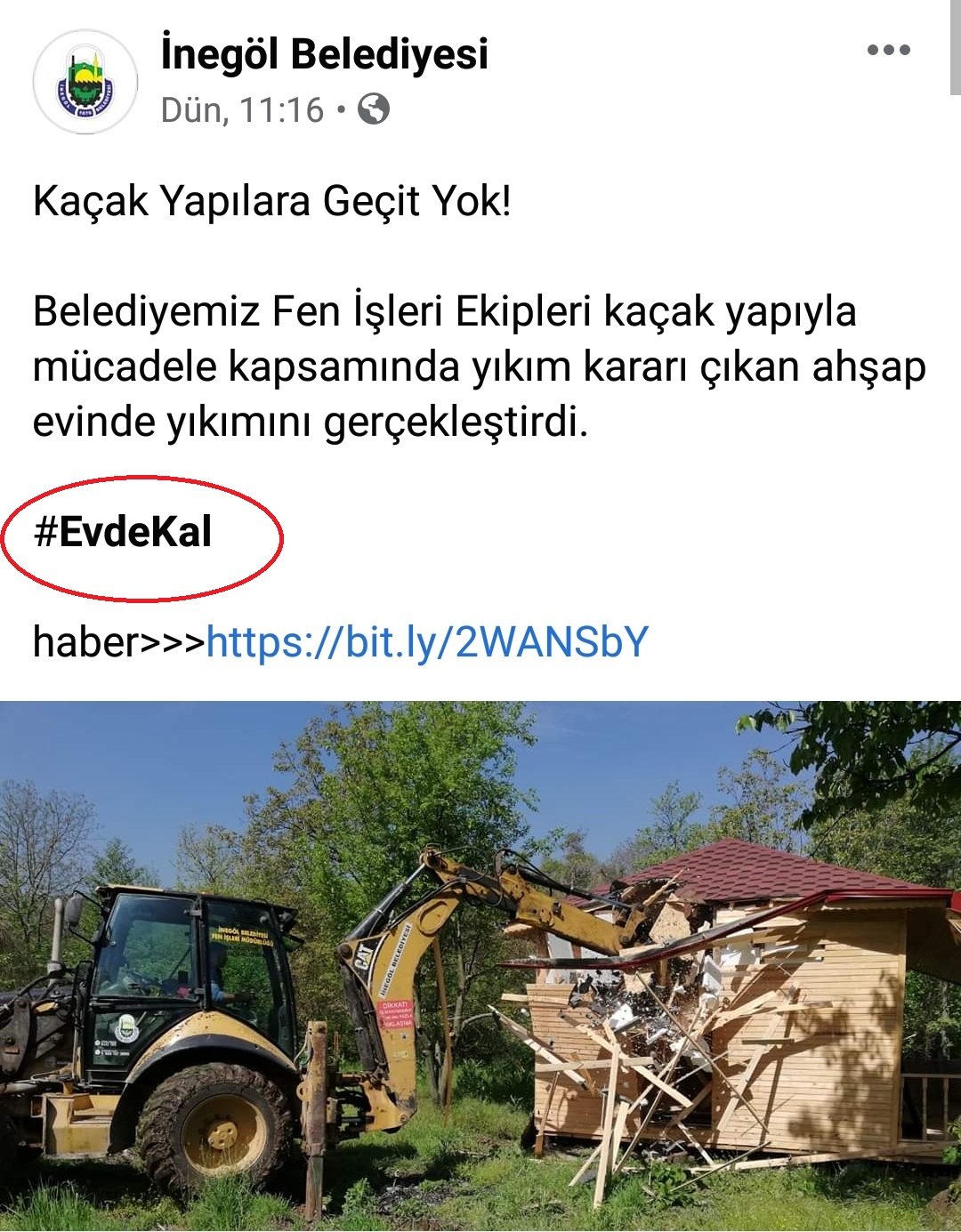 Bursa’da AKP’li İnegöl Belediyesi ekipleri, Çayyaka Mahallesi’ndeki bir tarla içine bir vatandaşın inşa ettiği ahşap evi iş makinesiyle yıktı. Yıkımı sosyal medyadan #EvdeKal etiketiyle paylaşan belediyeye tepki yağdı.