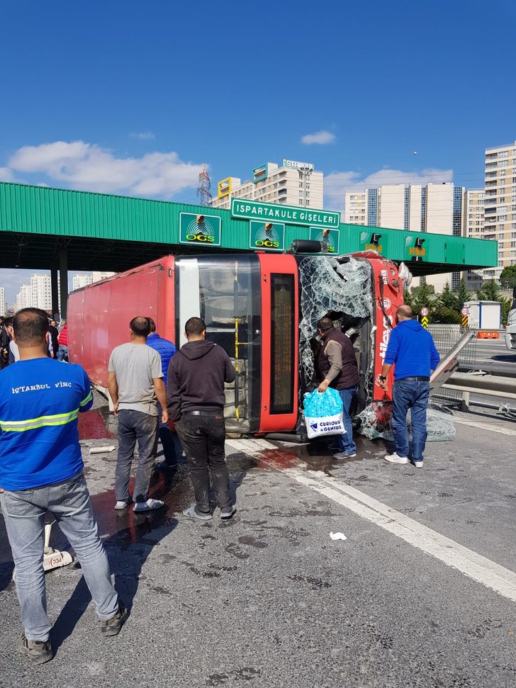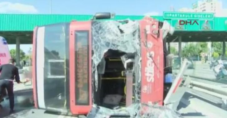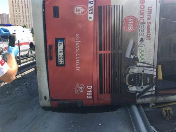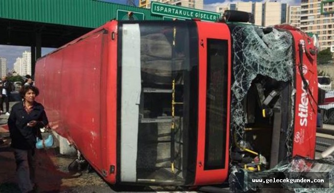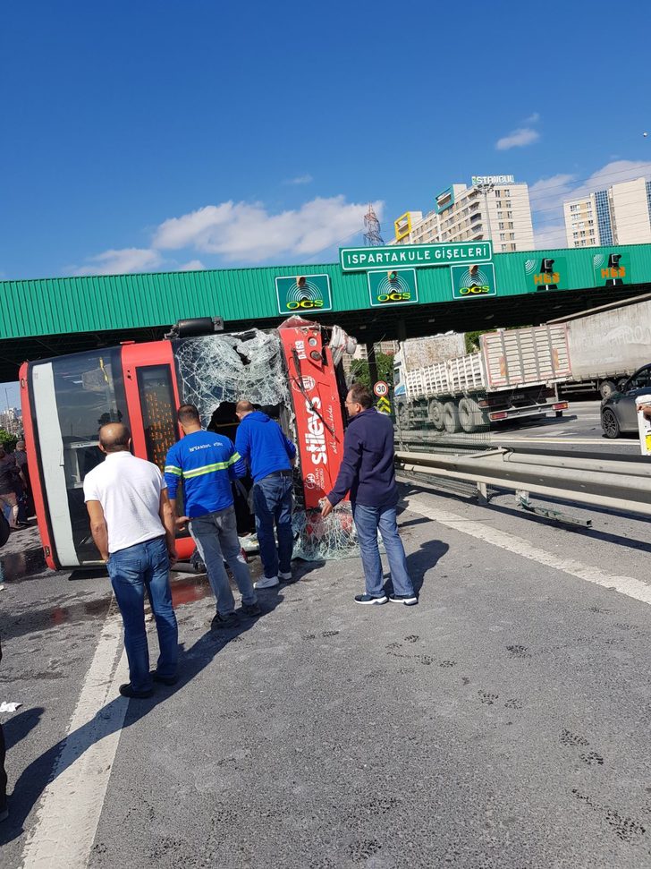 Alınan bilgiye göre, TEM Otoyolunda Bahçeşehir-Esenkent seferini yapan iki katlı özel halk otobüsü, Ispartakule gişelerinden geçerken henüz belirlenemeyen bir nedenle beton bloklara çarparak yan yattı. Kazada, ilk belirlemelere göre otobüsteki 15 kişi yaralandı. Yaralılar, olay yerine sevk edilen sağlık görevlilerinin ilk müdahalesinin ardından ambulanslarla çevredeki hastanelere kaldırıldı.OTOBÜS ŞOFÖRÜ: ÖN LASTİĞİ PATLADISaat 11.15’te meydana gelen ve Bahçeşehir- Bakırköy hattında çalışan iki katlı
