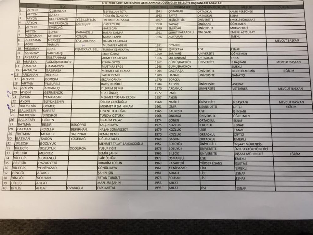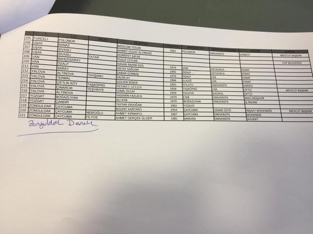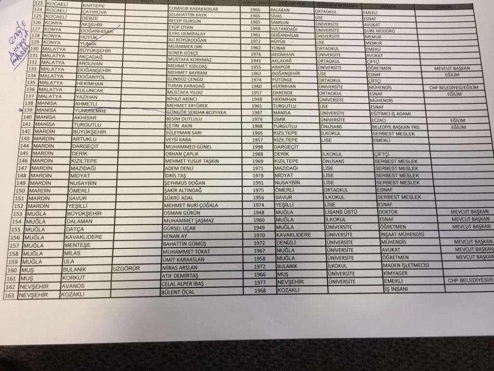 CHP'de belediye başkan adaylarının belirlenmesi için hareketli saatler yaşanıyor. CHP Parti Meclisi, CHP Genel Başkanı Kemal Kılıçdaroğlu başkanlığında toplandı. CHP MYK’den geçen liste Parti Meclisi’nin onayına sunulurken, kritik toplantının ardından 300 belediye başkan adayının daha açıklanması bekleniyor.Öte yandan kulislere adaylıkları netleşen ilk isimler de yansımaya başladı. Cumhuriyet'in edindiği bilgilere göre; Edirne, Hatay, Sinop, Çanakkale, Eskişehir, Karaman, Kırşehir, Mardin, Muğla, Konya-Ereğli, ve Tunceli adayları belli oldu.İşte şuana kadar isimleri netleşen CHP'nin aday listesi:Edirne: Recep GürkanHatay: Lütfü SavaşSinop: Barış AyhanÇanakkale: Ülgür GökhanEskişehir: Yılmaz BüyükerşenKaraman: Emin EgeKırşehir: Selahattin EkicioğluMardin: Süleyman SarıMuğla: Osman GürünKonya-Ereğli: Bülent Ecevit TatlıdilTunceli: Yusuf Kenan Aydın