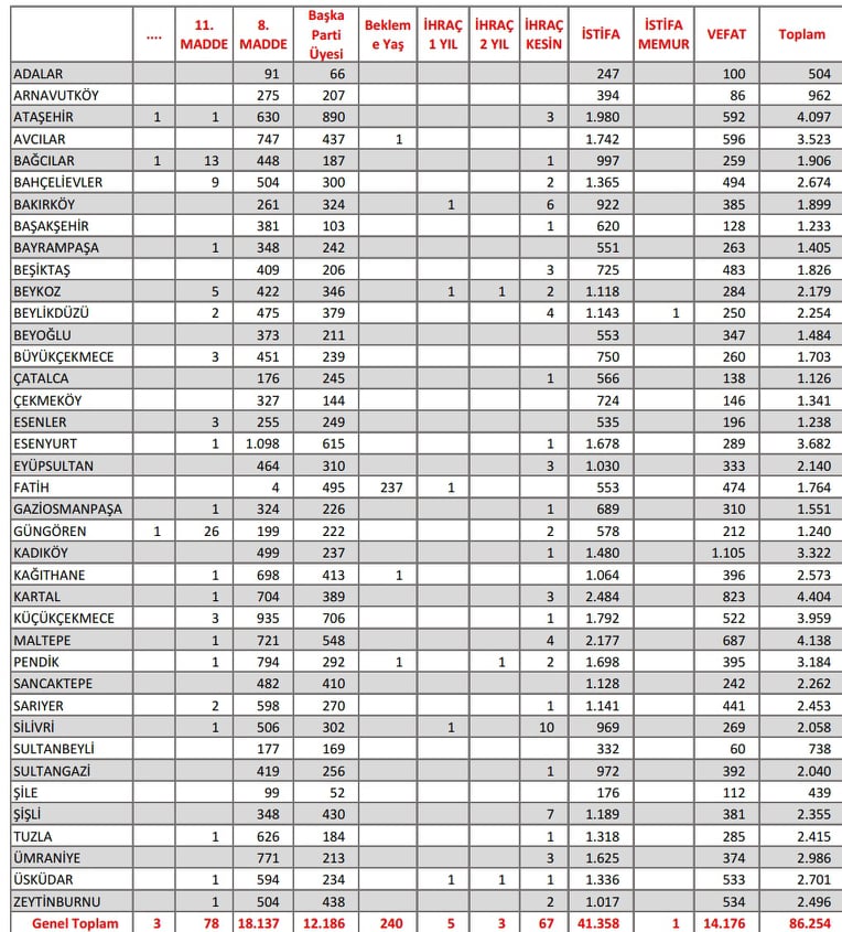 İstanbul CHP ilçelerindeki üye kayıpları..