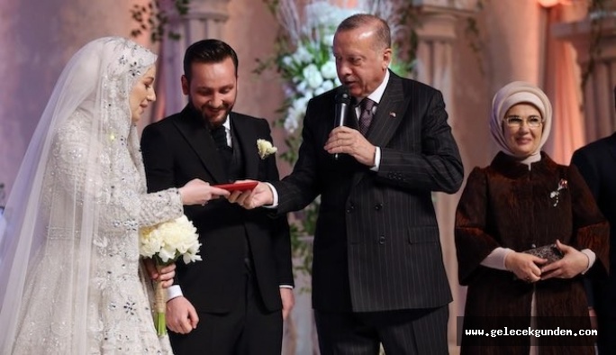 Nikahın ardından çifti tebrik eden Erdoğan, evlilik cüzdanını geline verdi.Erdoğan, "Her nikahta benim tavsiyem. Bir olur garip olur, iki olur rakip olur, üç olur denge olur, dört olur bereket olur. Gerisi Allah kerim" dedi.