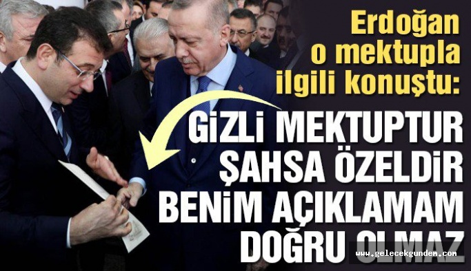 İmamoğlu'nun Ankara'da kendisine verdiği mektupla ilgili konuşan Cumhurbaşkanı Erdoğan, "Bu mektup gizli bir mektup. Kendisi açıkladı mı bilmiyorum ama mektubun içeriği şahsa özel o yüzden benim içeriği açıklamam doğru olmaz" dedi.