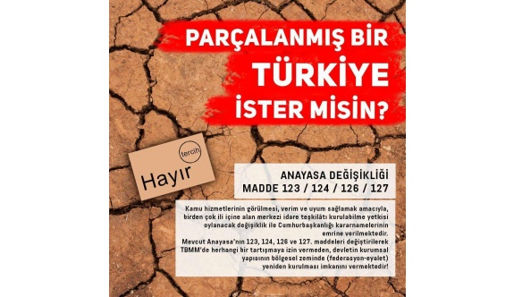 “Biz 150’ye yakın il ve ilçeye gittik ve tamamında Türkiye’nin bu Anayasa paketi ile eyaletlere bölünme tehlikesi yaşayacağını anlattık, çıt yok. Hiçbir cevap gelmedi. 150’ye yakın yerde bu anayasanın içinde özerk bölgeler yaratma yetkisi var. Biz bunu çok tehlikeli buluyoruz. Bunun çünki Irak’ta yaratılan özerk bölgenin bugün Kürdistan’a dönüşmesi halk oylaması yapıldı, yapılacak. Irak’ın dağılması gibi Türkiye’yi dağıtacak bir proje olarak görüyoruz. Suriye ve Irak’tan farkımız biz bir demokratik devlet olduğumuz için iç içe geçmişiz. Herkes her yerde. Kimin kim olduğu, kimin hangi etnik kökenden olduğu Türkiye’de önemsiz olmuş. Paketin içinde eyalet yapısı var. Bunu 150’ye yakın yerde söyledik. Fakat hiçbir cevap gelmedi.”
