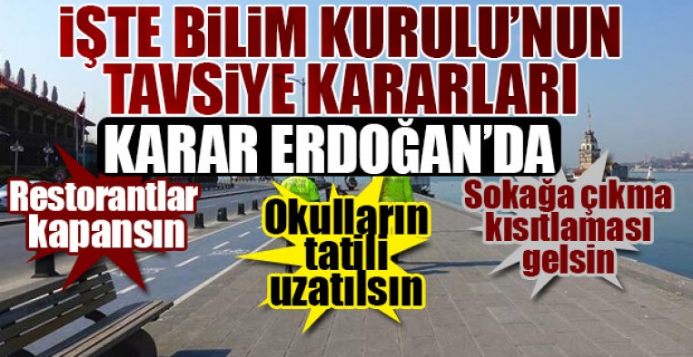Bilim Kurulu’nun bugünkü (Pazartesi) olağanüstü toplantısında ele alınan konuyu Cumhurbaşkanı’na sundu, Cumhurbaşkanı’nın bugün (17 Kasım Salı günü) bu yönde alınan kararları açıklaması bekleniyor.Sokağa çıkma yasağı uygulamasına gidileceğine ilişkin bir gelişme de İstanbul’daki restorancıların oluşturduğu kısa adı TURYİD olan Turizm Restaurant Yatırımcıları ve İşletmecileri Derneği’nin üyelerine akşam saatlerinde gönderdiği bir not oldu.TURYİD, üyelerine gönderdiği yazıda, alınan ön bilgiler çerçevesinde 19 Kasım Perşembe günü başlayıp 3-4 hafta sürecek dönemde restoranların kapalı olacağını duyurdu.TURYİD yazısında şöyle deniyor:Değerli Üyemiz, Başkanımızın almış olduğu ön bilgi çerçevesinde maalesef büyük olasılıkla restoranlara yine kapama gelmesi gündemdedir. Açıklamanın yarın akşam CB tarafından yapılması, uygulamanın başlangıç tarihinin 19 Kasım(Perşembe)olması, kapanış süresinin ilk aşamada 3-4 hafta ile sınırlı olması öngörülmektedir. Konuyu bilgilerinize sunarız. TURYİDBilim Kurulu’nun bugünkü toplantıdaki tavsiyelerinin bazılarının da şöyle olduğu iddia edildi:*Eğlence mekanlarının tamamen kapatılması*Restoranların tamamen paket servise geçmesi *Okulların tatilinin uzatılması*Bazı şehirlerde kısmi sokağa çıkma yasağı "SOSYAL HAYATA CİDDİ KISITLAMALAR GETİRİLEBİLİR"Hürriyet gazetesi yazarı Orkun Ün, yeni tip Koronavirüs (Covid-19) tedbirleri kapsamında kısıtlamaların artabileceğini belirterek, " 20:00–06:00 arası eve kapanabiliriz" görüşünü savundu. Ün yazısında, "Son günlerde gittiğim mekanlarda hep aynı sorular soruluyor bana. 'Restoranlar 20:00’de kapanacakmış doğru mu?' 'Komple kapatacaklarmış bizi duydun mu?' 'Hafta sonu sokağa çıkma yasağı olacak sadece paket servis yapacağız diyorlar, bilgin var mı?' Baktım ki sorulara cevap veremiyorum, birkaç kişiyle konuşup işin doğrusunu öğreneyim dedim.Maalesef haberler kötü. Bilim Kurulu 2 haftalık bir kapanma istiyor. Eğer komple kapanma uygulanmazsa masadaki bir diğer seçenek 20:00–06:00 arası geçerli olacak bir sokağa çıkma yasağı. Can sıkıcı ama maalesef restoran ve kafelerin kapıları kısa süre sonra kapanabilir. Sosyal hayata ciddi kısıtlamalar getirilebilir.