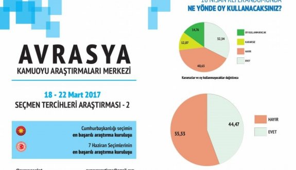 Ancak kararsızlar ve oy kullanmayacaklar dağıtılınca, anket sonucunda %44.47'lik EVET oranına karşılık % 55.53'lük oran ile 'HAYIR' oyu referandumda galip geliyor.'Hollanda krizi 'EVET' oyunu arttırmak için'Referandumda 'EVET' oyu vereceğini söyleyen katılımcıların %55.3'ü, iktidarın Hollanda ile yaşanan toplantı krizini evet oylarını arttırmak için çıkardığı görüşünde.'KHK'ler ile haksızca insanlar işinden oldu'Ankete katılan kişilere referandum haricinde KHK’ler ile kamu kurumlarından atılanlar ile ilgili düşünceleri de soruldu. %44.3'lük bir oran "Birçok suçsuz insan da işten çıkarıldı" görüşündeyken, %27.3'lük bir oran "Hayır işten çıkarmaların tümü haksız" cevabını verdi. Öte yandan "işten çıkarmaların tümü haklı" görüşünde olan katılımcıların oranı ise %19.4.Katılımcılar, KHK'ler ile işten çıkarılanlar ile ilgili devletin adil davranmadığını düşüncesinde. Bu görüşün oranı %76.2 iken yalnızca %15.7'lik bir oran adil bir tutumun olduğu görüşünde.