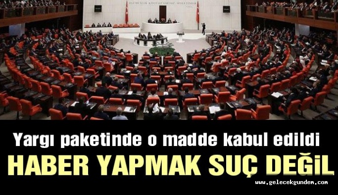 TBMM Genel Kurulunda ele alınan yargı paketinin en önemli maddelerinden biri olan ve ”Haber verme sınırlarını aşmayan veya eleştiri amacıyla yapılan düşünce açıklamaları suç oluşturmaz” ilkesini getiren hüküm, kabul edildi.Bu değişiklik Terörle Mücadele Kanununun 7. maddesine eklendi. 7. madde terör örgütü propogandası yapanlara verilecek cezaları düzenliyor ve bu suçun basın yolu ile işlenmesi hâlinde cezanın arttırılmasını öngörüyor. Çok sayıda gazetecinin de yargılandığı bu maddeye eklenen fıkra ile, haber verme sınırlarını aşmayan eleştiri ve düşünceler artık suç olmayacak.CHP ve İYİ Parti sözcüleri TBMM'de yaptıkları konuşmada bugüne kadar, muhalifleri susturma amaçlı kullanılan bu maddenin aynı anlayışla devam ettirilmemesini istediler. AKP Grup Başkanvekili Özlem Zengin ise ”Bu madde özgürlüklerle alakalı… İfade özgürlüğü için önemli bir durum getiriyor” dedi.Terörle Mücadele yasasının 7. maddesinde ‘'Cebir ve şiddet kullanılarak; baskı, korkutma, yıldırma, sindirme veya tehdit yöntemleriyle, suç işlemek üzere, terör örgütü kuranlar, yönetenler ile bu örgüte üye olanlar Türk Ceza Kanununun 314 üncü maddesi hükümlerine göre cezalandırılır. Örgütün faaliyetini düzenleyenler de örgütün yöneticisi olarak cezalandırılır. Terör örgütünün; cebir, şiddet veya tehdit içeren yöntemlerini meşru gösterecek veya övecek ya da bu yöntemlere başvurmayı teşvik edecek şekilde propagandasını yapan kişi, bir yıldan beş yıla kadar hapis cezası ile cezalandırılır. Bu suçun basın ve yayın yolu ile işlenmesi hâlinde, verilecek ceza yarı oranında artırılır. Ayrıca, basın ve yayın organlarının suçun işlenmesine iştirak etmemiş olan yayın sorumluları hakkında da bin günden beş bin güne kadar adli para cezasına hükmolunur'' deniliyor. Şimdi bu maddeye ”Haber verme sınırlarını aşmayan veya eleştiri amacıyla yapılan düşünce açıklamaları suç oluşturmaz” hükmü ekleniyor.