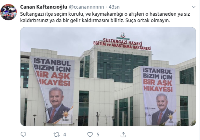 Sultangazi Haseki Eğitim Araştırma Hastanesi boydan boya AKP'nin İBB başkan adayı Binali Yıldırım pankartı ile kaplandı. AKP'nin seçim kanunlarını, etiği hiçe sayan uygulamasına CHPİstanbul İl Başkanı Canan Kaftancıoğluda sert tepki gösterdi.CHP eski milletvekili Barış Yarkadaş'ın gündeme getirdiği afişleri Twitter hesabından paylaşan Kaftancıoğlu'nun tepkisi sert oldu. Kaftancıoğlu seçim kurulunu ve kaymakamlığı göreve çağırdı. Kaftancıoğlu, "Sultangazi İlçe Seçim Kurulu, ve Kaymakamlığı o afişleri o hastaneden ya siz kaldırtırsınız ya da bir gelir kaldırmasını biliriz. Suça ortak olmayın" çağrısında bulundu.