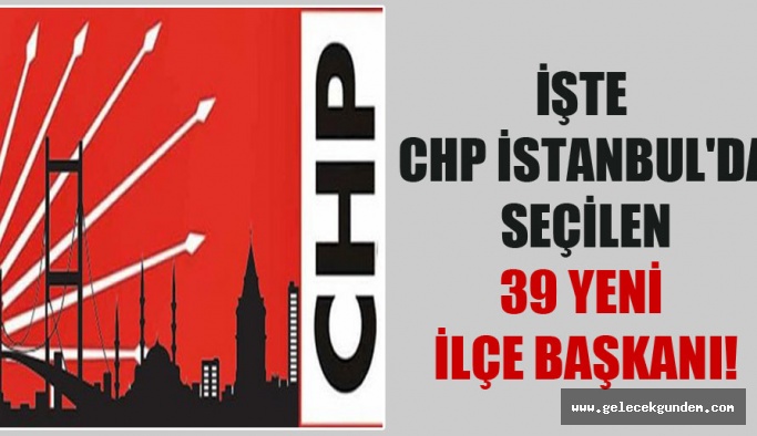 37. Olağan CHP İstanbul İl Kongresi’nde 39 ilçede yapılan seçimlerde il delegesi olan parti üyeleri, doğal delegeler (İstanbul milletvekilleri, il yönetim kurulu, il disiplin kurulu üyeleri) oy kullanabilecek.CHP İstanbul İl Kongresi’nde 600’ün üzerinde delege oy kullanacak.İŞTE CHP İSTANBUL’DA SEÇİLEN 39 YENİ İLÇE BAŞKANI:Büyükçekmece : Hüseyin Remzi GökbulakBeylikdüzü : Taşkın ÖzerAvcılar : Erdal NasEsenyurt : Hüseyin ErginKüçükçekmece : Turgay ÖzcanBahçelievler : Özgür ÇelikBağcılar : Murat İmrekEsenler : Bülent ÜtebayZeytinburnu : Metin DoğanŞişli : Oya AkmanSultangazi : Murat PoyrazGaziosmanpaşa : Hakan BahçetepeSarıyer : Sevim YalınkılıçSancaktepe : Muharrem AydınSultanbeyli : Hayati BozkayaMaltepe : Ali Cengiz ErolAtaşehir : Celal YalçınŞile: İbrahim ÇelikKadıköy: Ali NarinÇekmeköy: Hüseyin KızıldaşBeşiktaş: Gözde FilSilivri: Berker EsenGüngören: Temel AkkoçEyüp: Doğan SarıtaşBayrampaşa: Hasan MutluÜmraniye: Zeynel KızılkayaKağıthane: Cihan İlim YeşildağFatih: Soner ÖzimerAdalar: Ali Ercan AkpolatTuzla: Eren Ali BingölBeykoz: Aydın DüzgünKartal:Efendi ArgunşahPendik: Doğan ÇakmakBeyoğlu:Şahin DilBaşakşehir:Deniz BakırÜsküdar: Suat ÖzçağdaşArnavutköy: Özlem KutbayBakırköy: Celal SevinçÇatalca: Mehmet Seddar Çoban
